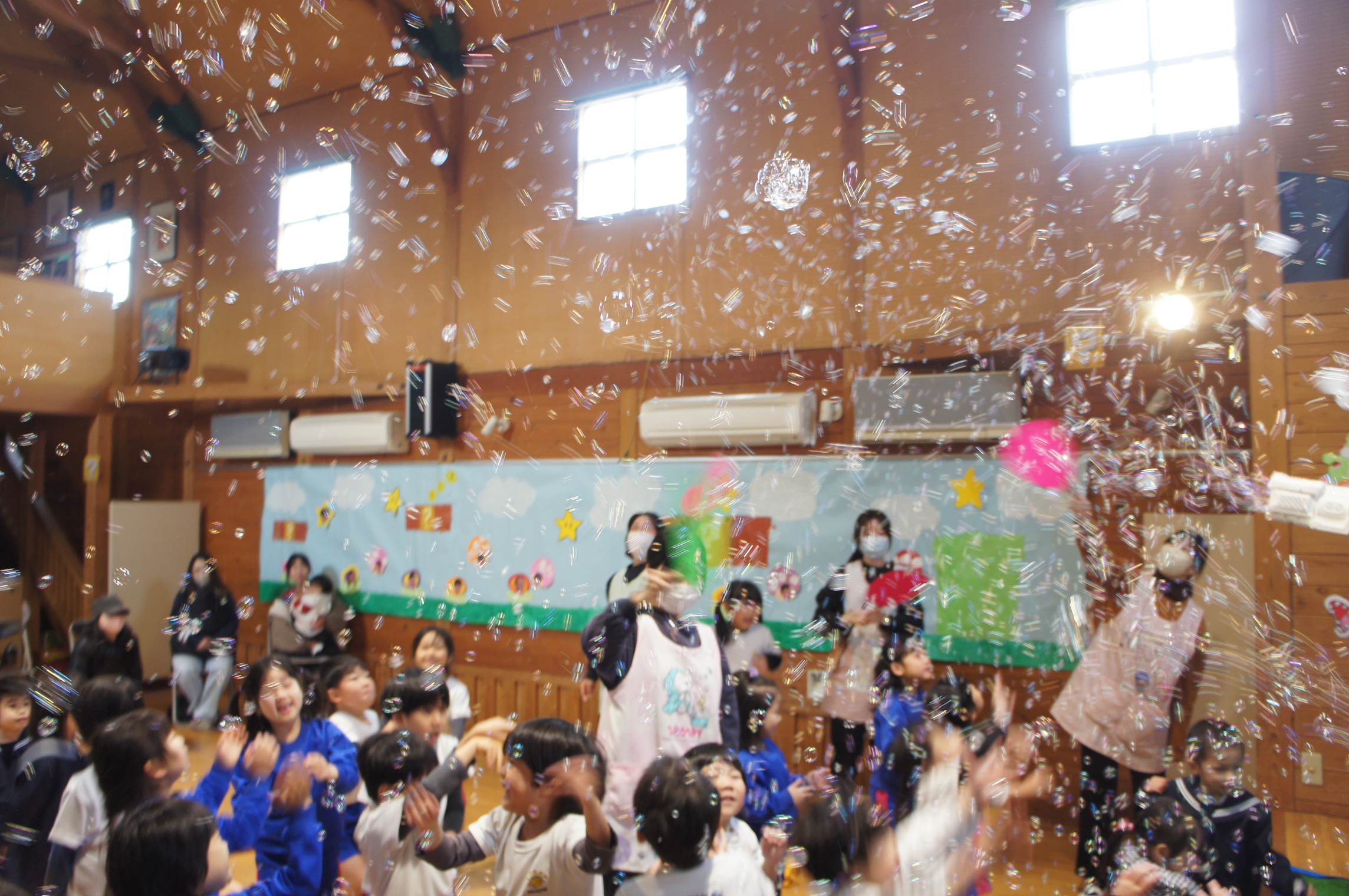 月 行事 4月 第1学期始業式・入園式・花まつり 5月 園外保育 6月 プール開き・遠足 7月 第1学期終業式・園外保育・1学期スペシャルデー【写真はシャボン玉ショー】 8月 夏季保育・お盆の夕べ 9月 第2学期始業式 10月 運動会・園外保育・お芋掘り 11月 2学期スペシャルデー・どんぐり拾い・おみせやさんごっこ 12月 お遊戯会・第2学期終業式 1月 第3学期始業式・年長組おわかれ遠足 2月 3学期スペシャルデー・園外保育 3月 おたのしみかい・卒園式・年度修了式